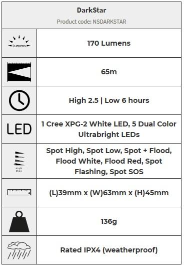 NightSearcher DarkStar is a multi-functioning battery-powered LED head torch with a genius automatic light level recognition mode: it switches itself on in the dark, and off again in well-lit areas. Providing five light modes, plus strobe and SOS modes, the DarkStar is equipped with a Cree XPG-2 White LED and five Dual Colour LEDs, so you can adjust the light level according to your requirements.