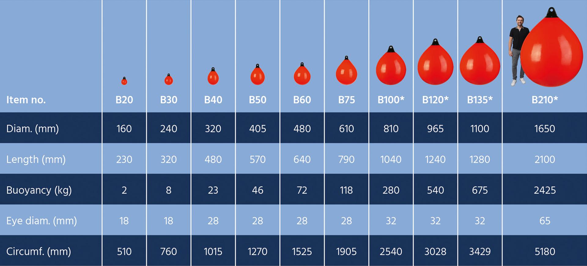 A Dan-Fender oferece a mais alta qualidade e a mais abrangente variedade de defensas Heavy Duty Marker Buoys, a partir da B20 com uma flutuabilidade bruta de 2,0 kg até à B210 com flutuabilidade bruta de 2.425 kg. Produzidas com cabo sólido, sistemas de válvulas de qualidade e 100% testadas antes de embaladas.