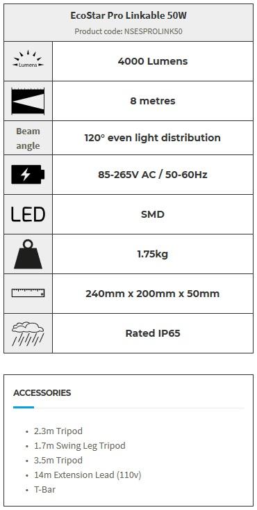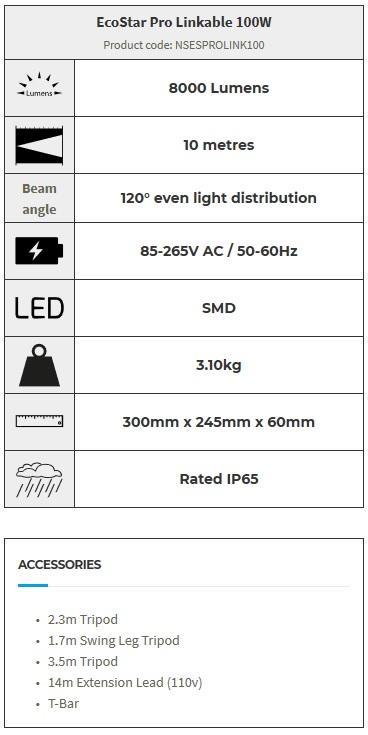 1 x EcoStar Pro Linkable light head + tripod (1.7, 1.9, or 3.5m)