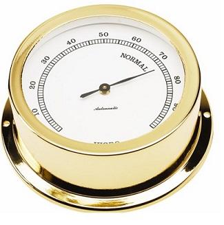 Higrômetro com letras pretas em um mostrador branco com ponteiro preto.