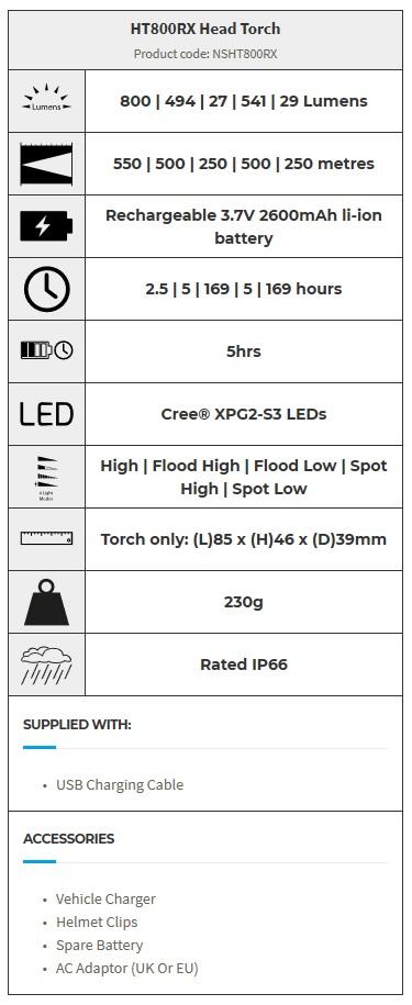 The super bright HT800RX head torch is a powerful rechargeable LED head torch for a variety of uses. The HT800RX uses advanced reactive proximity distance dimming, which automatically adjusts from spot (long distance) to flood (closeup) beam according to its surroundings. The HT800RX can be rechardged directly into the torch, or a spare rechargeable battery can be purchased and charged directly in your car or from your computer.