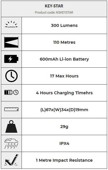 Light Power 300 lumens 110 metre beam Battery charging and status indicator USB charging cable included 2 Light modes - High, Dimmable Lock mode (on/off switch) USB charging port Battery status indicator