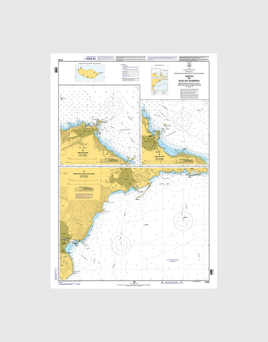 Carta náutica da série Aproximação com Planos dos Portos que se destina à aproximação e navegação nos portos de Machico e Caniçal, Porto Moniz e Porto da Cruz.
