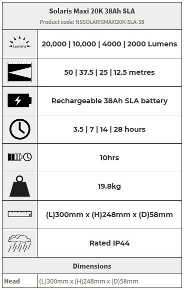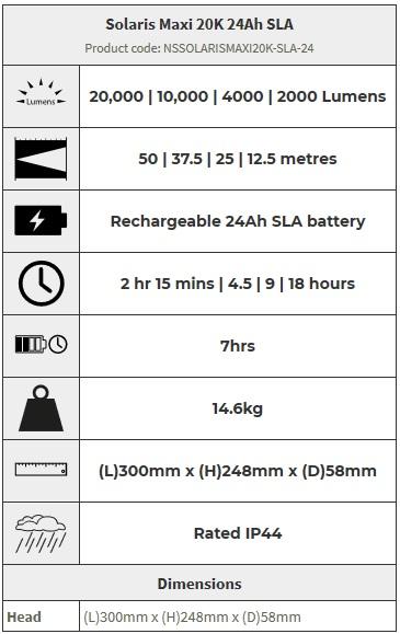 The Solaris Maxi 20K rechargeable SLA floodlights are designed for temporary lighting of large areas such as scenes of emergency. The new and improved Solaris Maxi 20K has a 20 000 lumen light output, and is easy to set up anywhere in under 2 minutes.