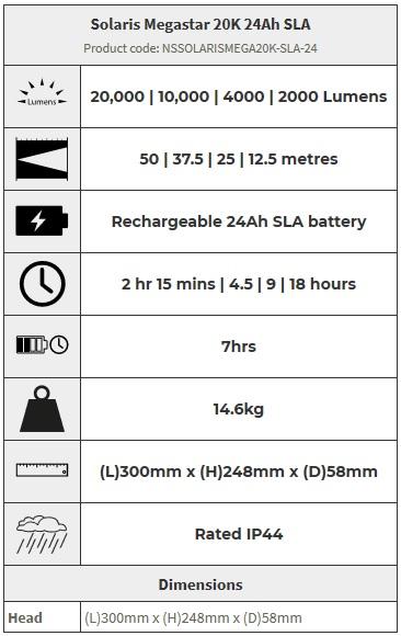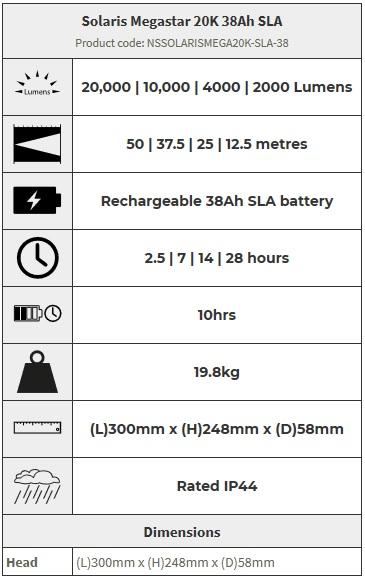 New and improved with a 20,000 lumen light output, the Solaris MegaStar 20K SLA rechargeable floodlights are designed for temporary floodlighting of large areas, such as scenes of crime or emergency, as well as sports and training fields.