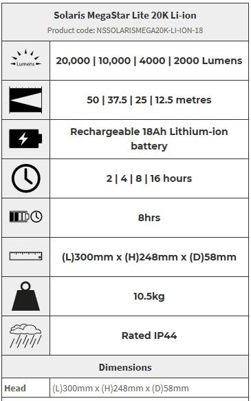 With its new and improved 20,000 lumen light head, the Solaris MegaStar Lite 20K floodlight is perfect for a wide range of sports events and coaching grounds. Solaris MegaStar Lite 20K is quick and easy to assemble, and 8 units will illuminate a 60 x 40 metre area for 2-16 hours, allowing players to train well into the night.