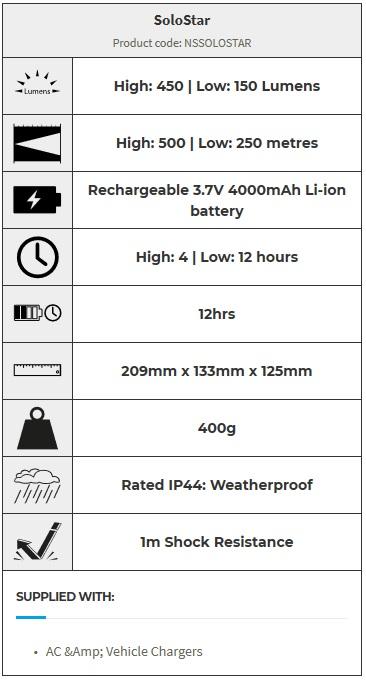 The SoloStar is an ultra lightweight rechargeable searchlight with a robust polypropylene casing in hi-vis green. Due to its weight, the SoloStar is ideal for outdoor pursuits such as camping and hiking, as well as for professional use. The SoloStar has an integrated powerbank, so can easily charge your phone or tablet on the go!