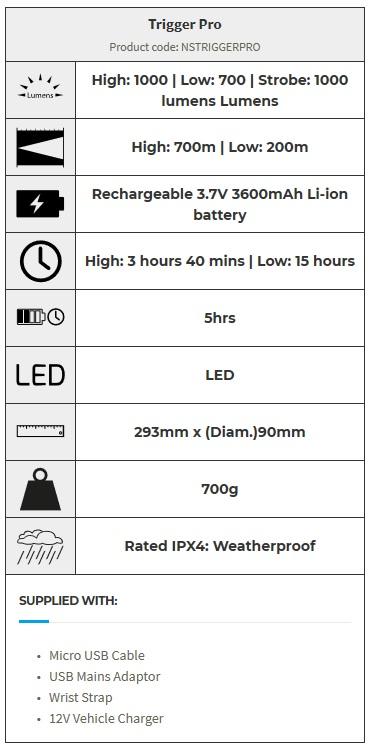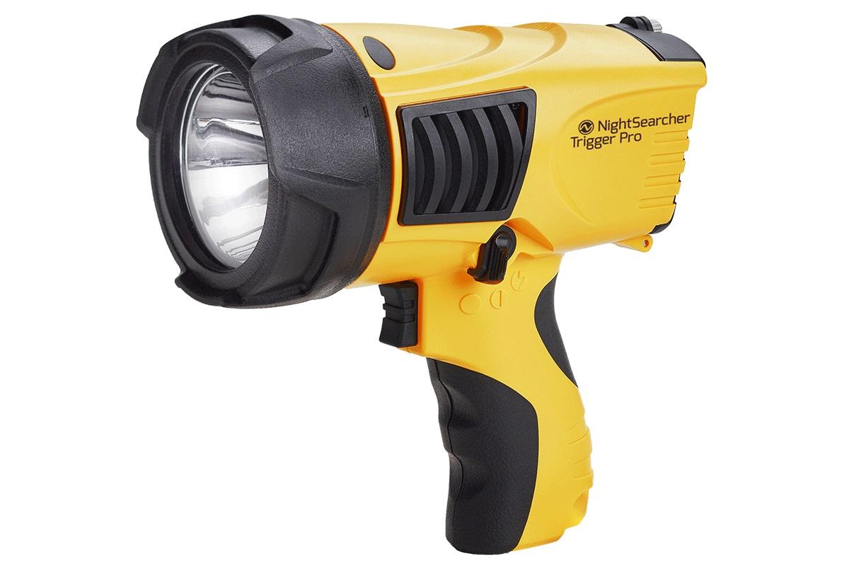 The rechargeable Trigger Pro searchlight is a lightweight LED alternative to the old, inefficient 2-3 million candle power halogen searchlights. The unique deep dish reflector system combined with high intensity Cree® LED provide a spot beam able to cover up to 700 metres.